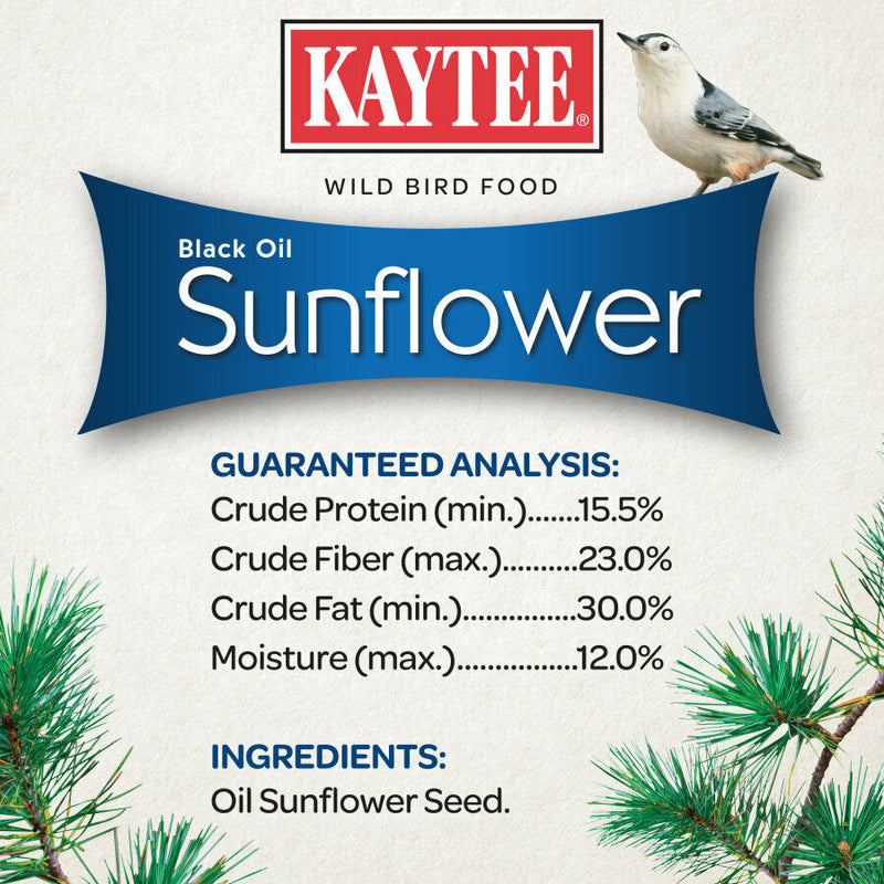 Kaytee Black Oil Sunflower is the best single grain for attracting the widest variety of wild birds. High oil content is a great source of energy|Thinner hulls make it easier to eat|Appealing to smaller songbirds|Kaytee Black Oil Sunflower is the best single grain for attracting the widest variety of wild birds