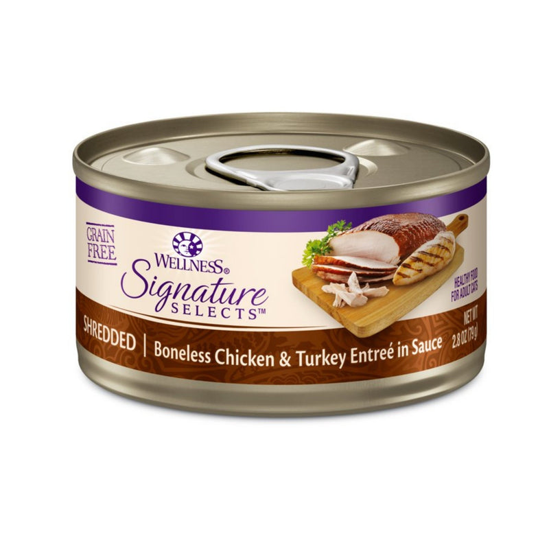 Wellness CORE is based on the nutritional philosophy that cats, given their primal ancestry, thrive on a diet mainly comprised of meat. CORE Signature Selects Chicken & Turkey gourmet canned wet cat food naturally delivers the variety your cat craves from a selection of 8 different recipes to choose from. Each grain-free recipe features delicate cuts of high-quality meat or seafood in delicious sauces. CORE Signature Selects recipes are hand packed with real meat shreds and provide the daily nutrition and hydration your cat needs to thrive. Each recipe combines carefully sourced ingredients to deliver the energy and nutrition your cat needs for a happy life and never contains any by-products, wheat, corn, or soy.