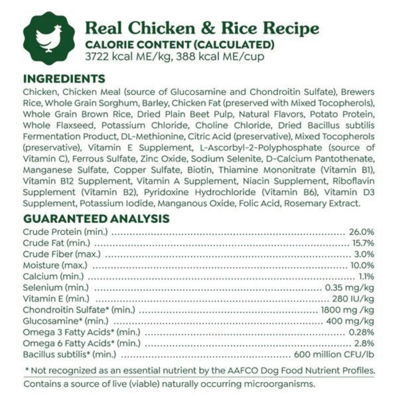 Chicken, Chicken Meal (source of Glucosamine and Chondroitin Sulfate), Brewers Rice, Whole Grain Sorghum, Barley, Chicken Fat (preserved with Mixed Tocopherols), Whole Grain Brown Rice, Dried Plain Beet Pulp, Natural Flavors, Potato Protein, Whole Flaxseed, Potassium Chloride, Choline Chloride, Dried Bacillus subtilis Fermentation Product, DL-Methionine, Citric Acid (preservative), Mixed Tocopherols (preservative), Vitamin E Supplement, L-Ascorbyl-2-Polyphosphate (source of Vitamin C), Ferrous Sulfate, Zinc Oxide, Sodium Selenite, D-Calcium Pantothenate, Manganese Sulfate, Copper Sulfate, Biotin, Thiamine Mononitrate (Vitamin B1), Vitamin B12 Supplement, Vitamin A Supplement, Niacin Supplement, Riboflavin Supplement (Vitamin B2), Pyridoxine Hydrochloride (Vitamin B6), Vitamin D3 Supplement, Potassium Iodide, Manganous Oxide, Folic Acid, Rosemary Extract.