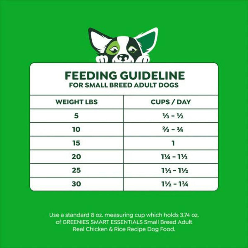The Greenies brand is on a mission to promote your canine companion’s well-being from teeth to tail! Greenies Smart Essentials Small Breed Adult High Protein Dry Dog Food Real Chicken & Rice Recipe offers science-backed nutrition with an irresistible taste. This nutritious dog food recipe features real chicken as the #1 ingredient and is designed to help support 6 key areas of your furry friend’s health: digestion, immune system, teeth, skin & coat, bones & joints, and muscles, including the heart. Greenies Smart Essentials Small Breed Adult Dry Dog Food is formulated without corn, wheat, soy, or chicken by-product meal and no artificial flavors or preservatives*. Made with natural ingredients plus vitamins, minerals, and nutrients, Greenies Smart Essentials Small Breed Adult High Protein Dry Dog Food is guaranteed to bring joy to mealtime with tail-wagging flavor. Love it or your money back! *Trace amounts may be present due to potential cross-contact during manufacturing