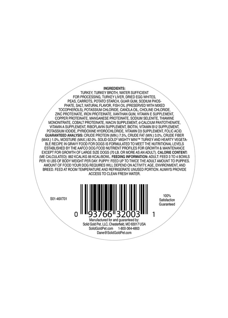 They say big things come in small packages, and toy breed and small breed dog owners can certainly attest! Help fuel your dog’s giant personality with nutrition perfectly balanced for their mini size with Solid Gold Mighty Mini Grain Free with Real Turkey & Hearty Vegetables Small & Toy Breed Wet Dog Food. This grain free and gluten free recipe is packed with lean, easily digestible real turkey, fiber-rich farm fresh vegetables and a well-balanced blend of nutritious Superfoods and omega fatty acids. Mighty Mini features tailored levels of protein, fat and calories ideal for small and toy breeds. Mighty Mini will unleash your dog’s inner titan!