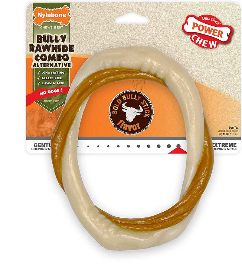 Satisfy your dogs instinctive chewing urge with the Power Chew Rawhide Alternative! From our unique line of natural alternatives, this nature-inspired dog chew toy is cleaner and safer than real rawhide and bully stick with all the same benefitsand no grease or odor. Its twisted ring shape and savory, calorie-free bully stick flavor will indulge your dogs craving for real animal parts. Created just for power chewers, this long lasting dog chew toy is made of durable nylon that will help discourage destructive chewing habits by keeping your furry friend entertained. Plus, it features a subtle textured surface that naturally helps clean teeth and freshen breath as your dog chews. Our medium dog chew toys are suitable for dogs up to 35 pounds. Odor-free nylon chew toy is cleaner and safer than real rawhide and bully sticks|Long-lasting, durable chew toy stands up to aggressive chewers and fights boredom|Textured ring chew toy looks and feels like real animal parts|Tough chew toy promotes healthy, non-destructive chewing habits br/>Sold in Quantity of: 1