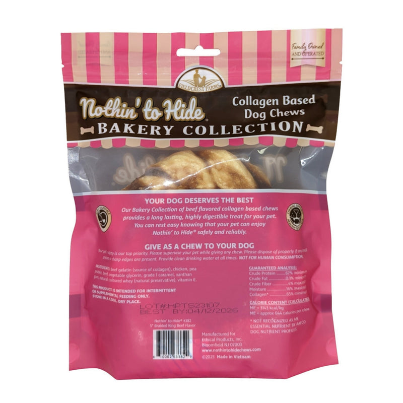Our Bakery Collection of beef flavored collagen based chews provides a long lasting, highly digestible treat for your pet. You can rest easy knowing that your pet can enjoy Nothin' to Hide safely and reliably. Contains 1-5 braided ring in a resealable pouch.