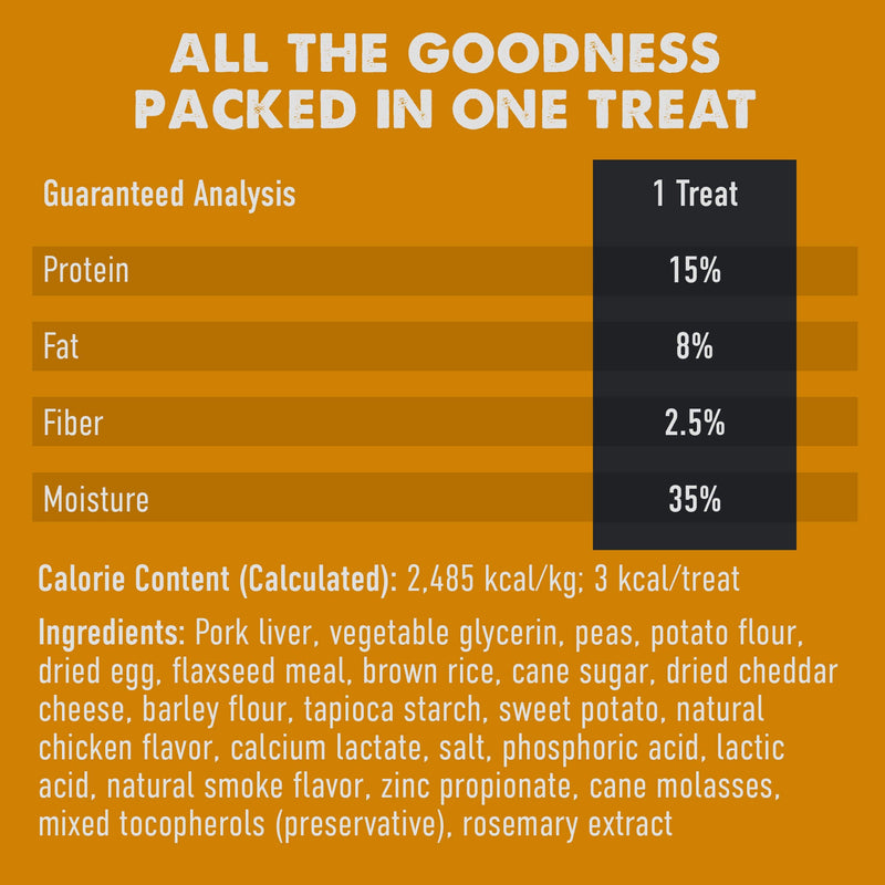 Pork liver, vegetable glycerin, peas, potato flour, dried egg, flaxseed meal, brown rice, cane sugar, dried cheddar cheese, barley flour, tapioca starch, sweet potato, natural chicken flavor, calcium lactate, salt, phosphoric acid, lactic acid, natural smoke flavor, zinc propionate, cane molasses, mixed tocopherols (preservative), rosemary extract.