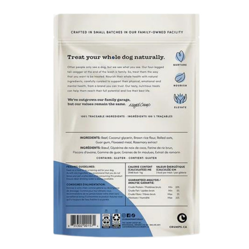 North American beef being the first ingredient in these all-natural, limited ingredient treats make them a great choice for training, puppies or picky dogs. Slowly baked to keep the flavor strong, combined with oats, a great source of protein, these semi-moist treats are also low calorie at 1.5 per treat. A soft and chewy texture and meaty flavour make these perfect for training or an everyday, rewarding treat.