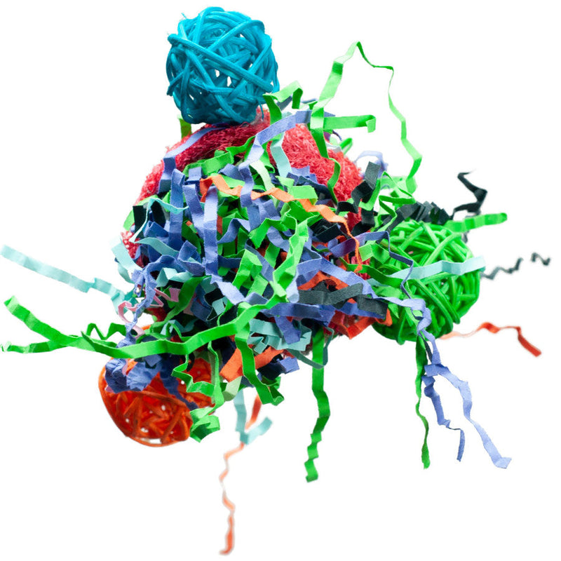 Nibbles Celebration Ball Toy is a chew toy for small animals such as hamsters, guinea pigs, gerbils and similar sized animals. This chew toy features multiple colorful wicker vine balls and colorful foraging paper sure to keep your small animal not only busy, but entertained. These chew toys help to reduce boredom while allowing your pet to satisfy the instinctive need to chew and forage. Dimensions for the Celebration Ball Toy is approx imately 6inx 4inx 3in.